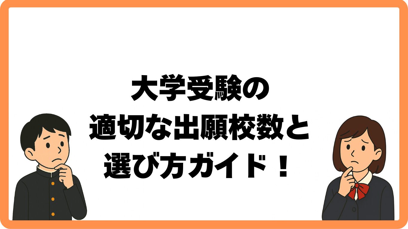 大学受験では何校受けるかは一人ひとり状況が違います。挑戦と安全のバランスを考え、無理のない出願計画を立ててください。早めに志望校をリストアップし、模試や家族の意見を参考にしながら準備を進めましょう。